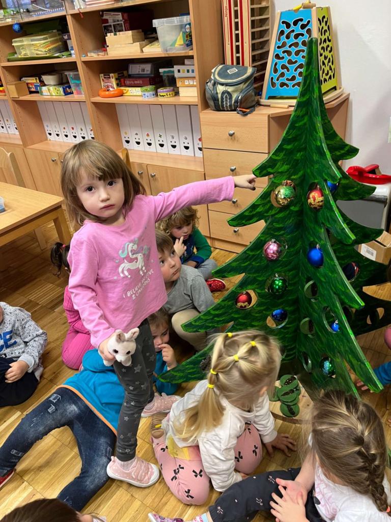 Zdobení vánočních baněk spojené s tematickým příběhem O vánočním stromečku.