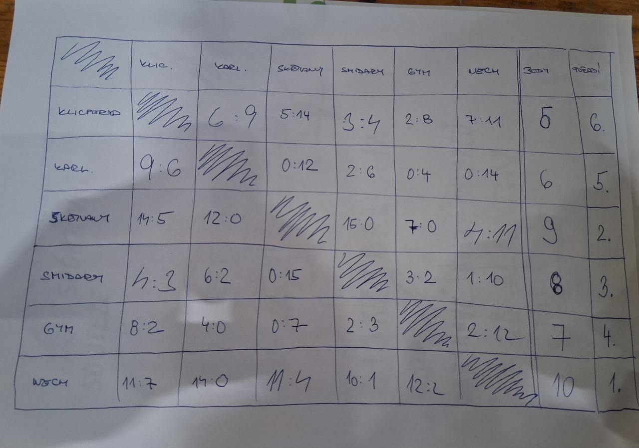 Jedinou překážkou na cestě za celkovým vítězstvím se opět stala ZŠ Nechanice, která nás v tomto školním roce dokázala porazit už na předchozím turnaji na Ekonomické škole. Tentokrát jsme podlehli výsledkem 11:4. Soupeř tak zaslouženě získal právo postupu do okresního finále v Hradci Králové.